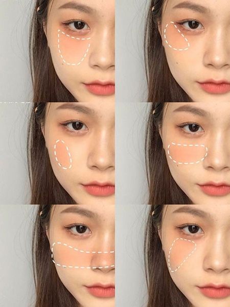 Theo Newsweek: “đặt blush trên gò má và hướng ra ngoài/thái dương sẽ khiến mặt trông thon và dài hơn” — ngược lại nếu đặt ở gần má nhiều hơn sẽ khiến mặt trông ngắn và tròn hơn.
