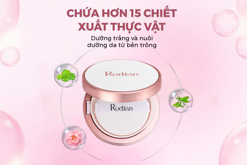 Cushion Rodian dùng các chiết xuất thực vật lành tính như: trà xanh, rau má, cúc la mã, lá tía tô, nha đam… giúp làm dịu da, giảm kích ứng và hỗ trợ phục hồi hàng rào ẩm. Công thức nói không với những thành phần gây bí da thường thấy ở cushion giá bình dân.